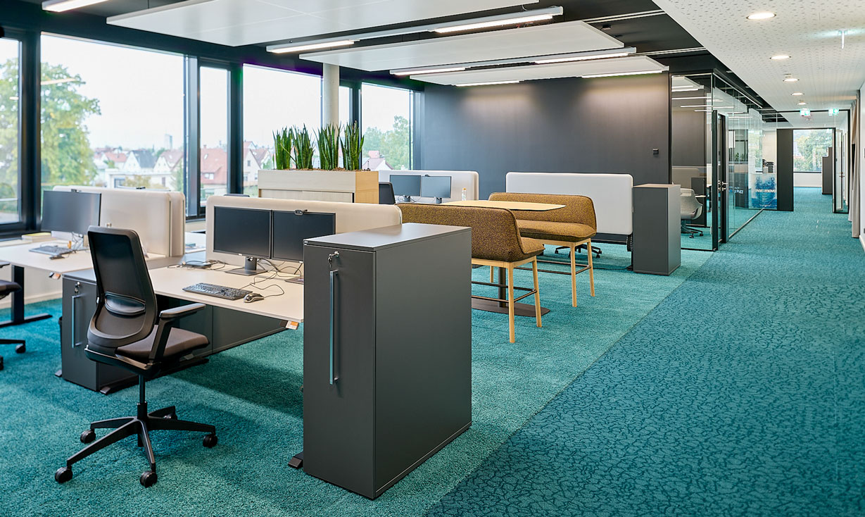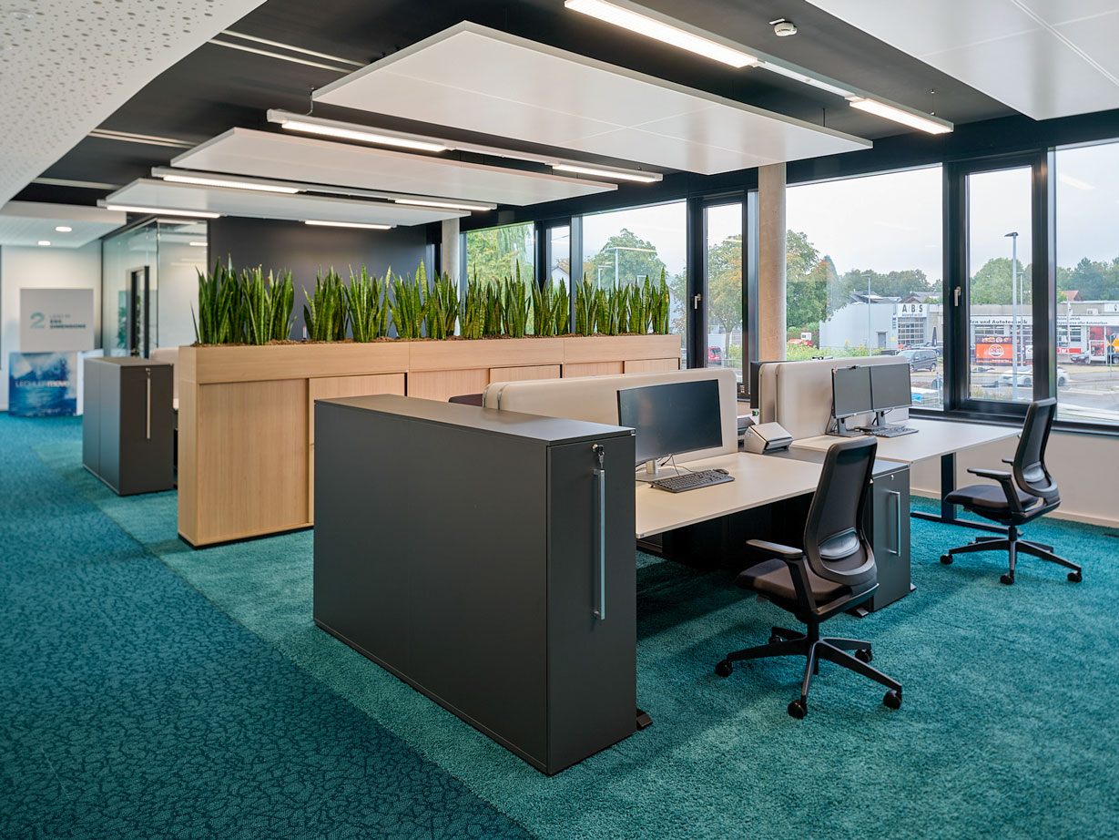 Klarheit und Struktur prägen den offenen Arbeitsbereich. Pflanzenelemente zonieren die Fläche und sorgen für akustische Balance. Zentrale Meeting Points fördern den spontanen Austausch, während kleinere Rückzugsräume ungestörtes Arbeiten ermöglichen.